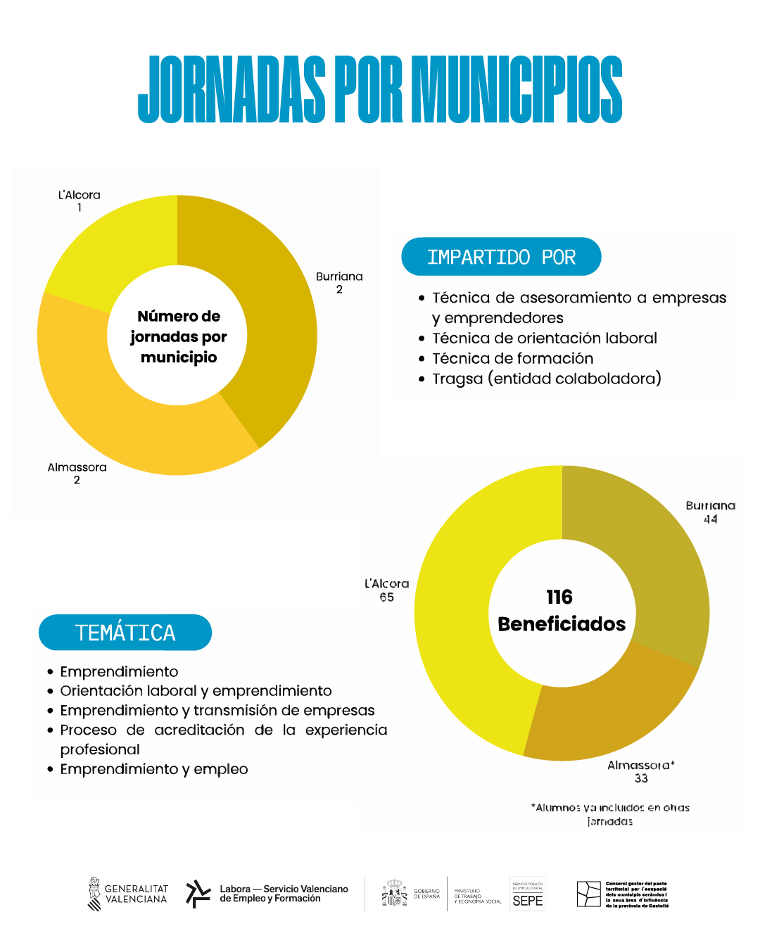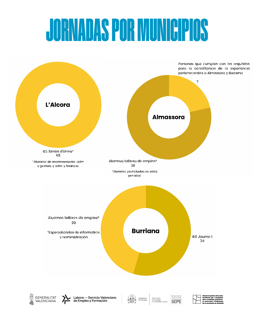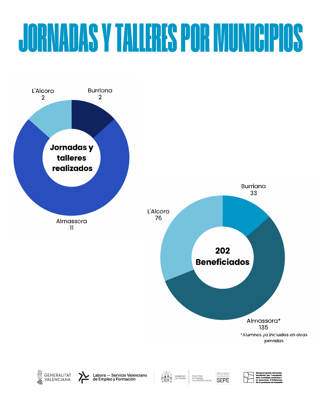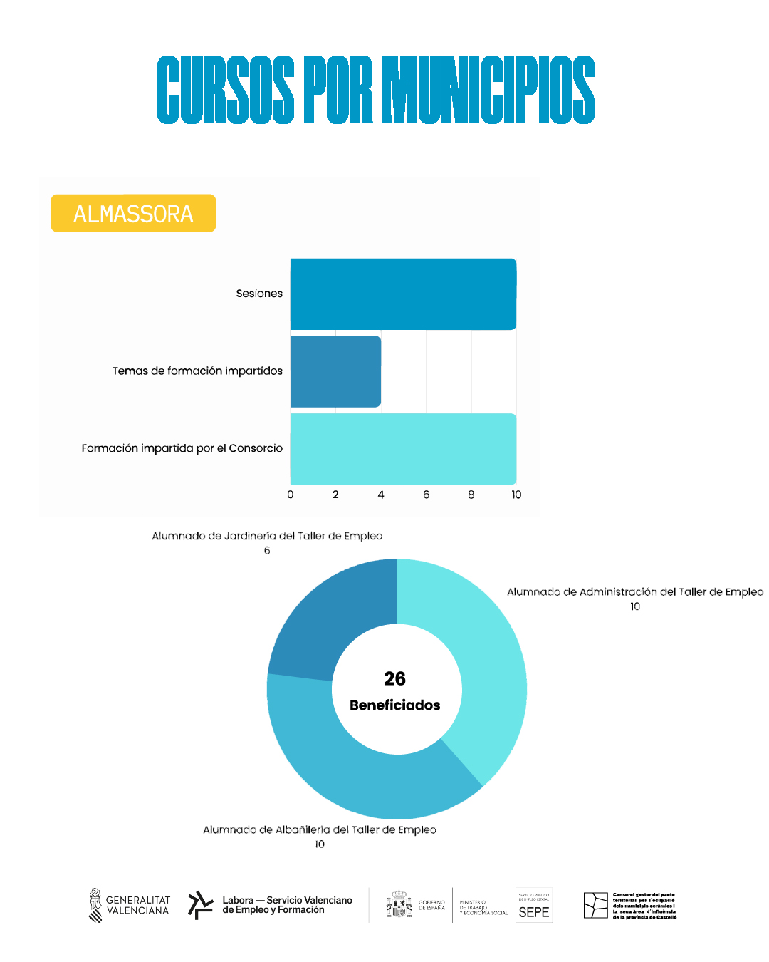 Por otro lado, en el municipio de Almassora, durante la primera fase, se han beneficiado 52 personas con los cursos de Orientación Laboral y Empredimiento, acreditación de la experiencia profesional con la borlaboración de Tragsa, y Emprendimiento y empleo. En la segunda fase se beneficiaron 93 personas con jornadas y cursos como la Jornada de Orientación Laboral y Emprendimiento, Jornada de Motivación para el Empleo, Reconocimiento de Competencias Profesionales, Técnicas de Búsqueda de Empleo y una master class sobre cerámica.